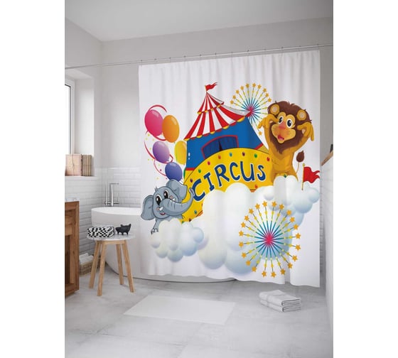 Штора (занавеска) для ванной JoyArty "Облачный цирк" из сатена, 180х200 см с крючками, sc_12751