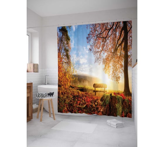 Штора (занавеска) для ванной JoyArty "Одинокая лавочка за лесом" из сатена, 180х200 см с крючками, sc_14620