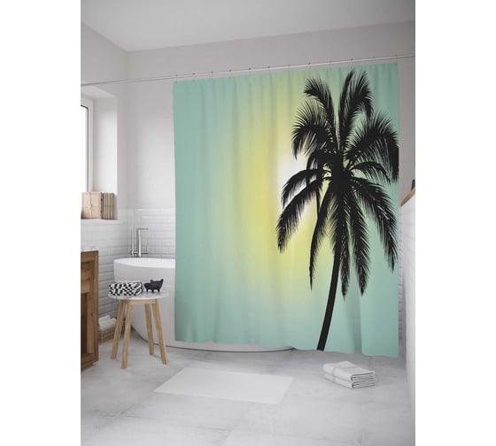 Штора (занавеска) для ванной JoyArty "Одинокая пальма на фоне солнца" из сатена, 180х200 см с крючками, sc_27789
