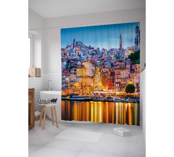 Штора (занавеска) для ванной JoyArty "Огни Порту" из сатена, 180х200 см с крючками, sc_36653