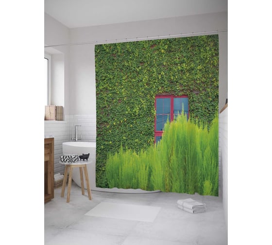 Штора (занавеска) для ванной JoyArty "Окно среди лиан" из сатена, 180х200 см с крючками, sc_32283