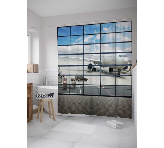 Штора (занавеска) для ванной JoyArty "Окно в аэропорту" из сатена, 180х200 см с крючками, sc_34810