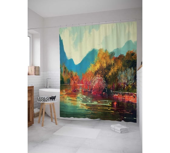 Штора (занавеска) для ванной JoyArty "Осень у горного озера" из сатена, 180х200 см с крючками, sc_38441