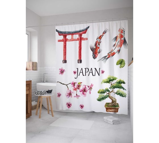 Штора (занавеска) для ванной JoyArty "Особенности Японии" из сатена, 180х200 см с крючками, sc_38773