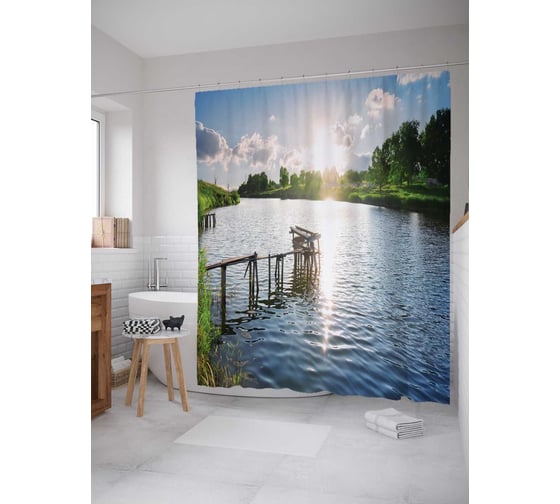 Штора (занавеска) для ванной JoyArty "Отдых у реки" из сатена, 180х200 см с крючками, sc_15174