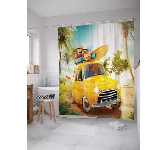 Штора (занавеска) для ванной JoyArty "Отпускное авто" из сатена, 180х200 см с крючками, sc_7525