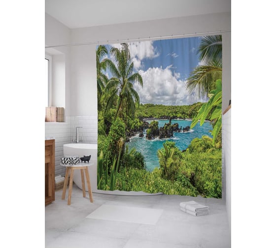 Штора (занавеска) для ванной JoyArty "Озеро посреди тропиков" из сатена, 180х200 см с крючками, sc_16258