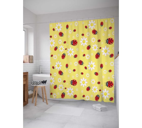 Штора (занавеска) для ванной JoyArty "Парад божьих коровок" из сатена, 180х200 см с крючками, sc_6121
