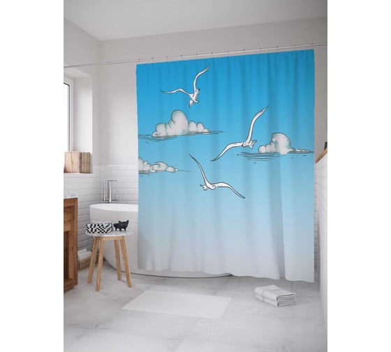 Штора (занавеска) для ванной JoyArty "Парящие чайки" из сатена, 180х200 см с крючками, sc_17516
