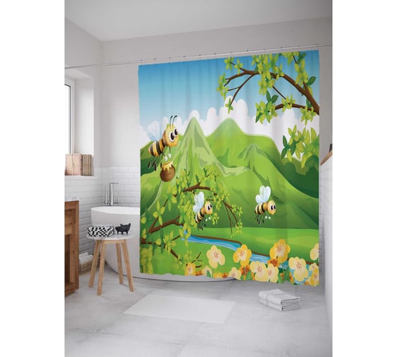 Штора (занавеска) для ванной JoyArty "Пчелки над цветами" из сатена, 180х200 см с крючками, sc_1218