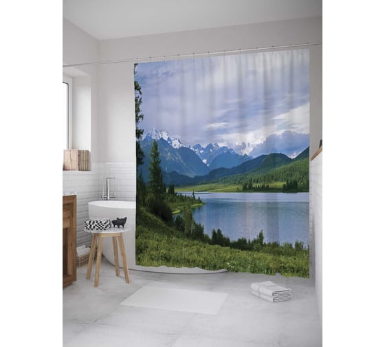 Штора (занавеска) для ванной JoyArty "Пейзаж гор" из сатена, 180х200 см с крючками, sc_32890