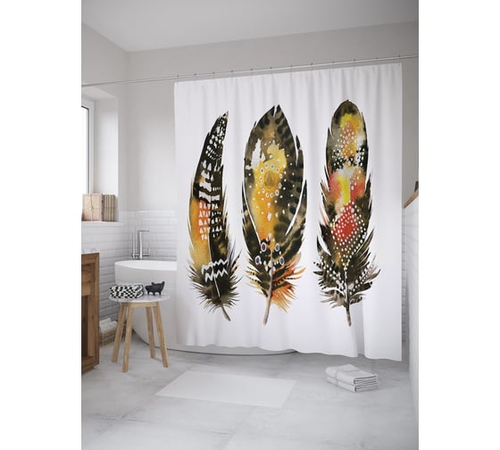 Штора (занавеска) для ванной JoyArty "Перо акварель" из сатена, 180х200 см с крючками, sc_59594