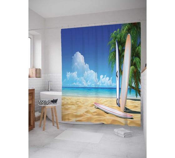 Штора (занавеска) для ванной JoyArty "Пляж серфингиста" из сатена, 180х200 см с крючками, sc_29177