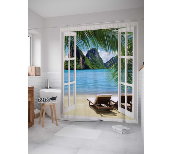 Штора (занавеска) для ванной JoyArty "Пляжное окно" из сатена, 180х200 см с крючками, sc_7780