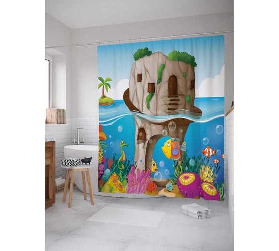 Штора (занавеска) для ванной JoyArty "Подводная скала" из сатена, 180х200 см с крючками, sc_18953