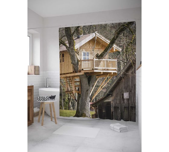 Штора (занавеска) для ванной JoyArty "Поместье на дереве" из сатена, 180х200 см с крючками, sc_8147