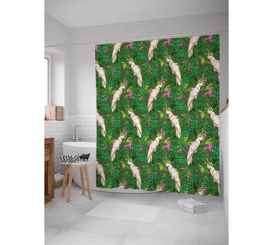 Штора (занавеска) для ванной JoyArty "Попугаи в тропиках" из сатена, 180х200 см с крючками, sc_50210