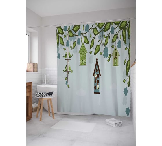 Штора (занавеска) для ванной JoyArty "Птичьи дома" из сатена, 180х200 см с крючками, sc_14264