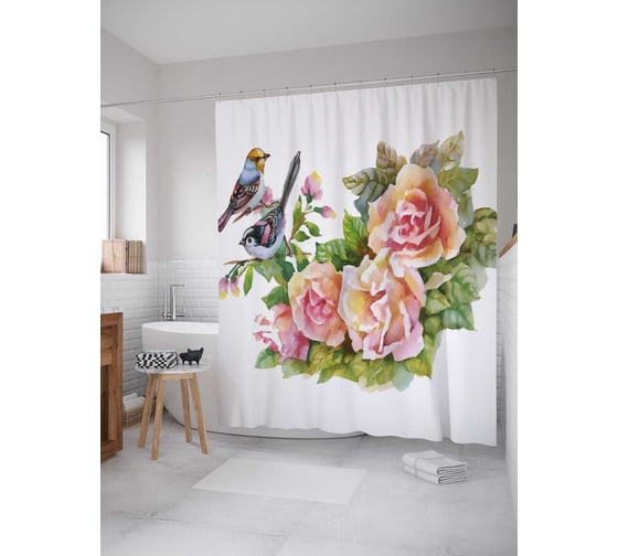 Штора (занавеска) для ванной JoyArty "Птицы на листьях цветов" из сатена, 180х200 см с крючками, sc_30313