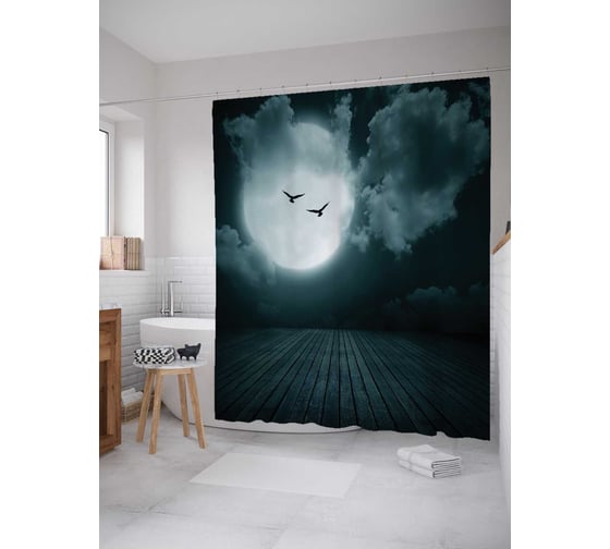 Штора (занавеска) для ванной JoyArty "Птицы спешат на луну" из сатена, 180х200 см с крючками, sc_15437