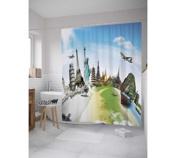 Штора (занавеска) для ванной JoyArty "Путешествие вокруг света" из сатена, 180х200 см с крючками, sc_9049