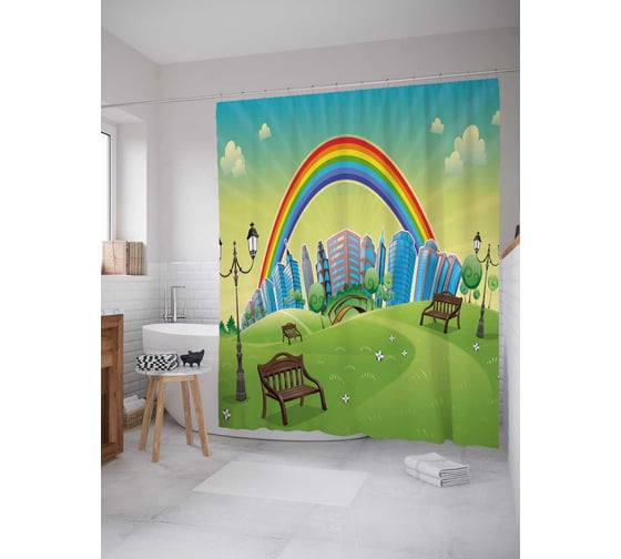 Штора (занавеска) для ванной JoyArty "Радуга над городом" из сатена, 180х200 см с крючками, sc_30779