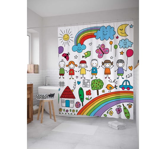 Штора (занавеска) для ванной JoyArty "Радужный мир" из сатена, 180х200 см с крючками, sc_38641235