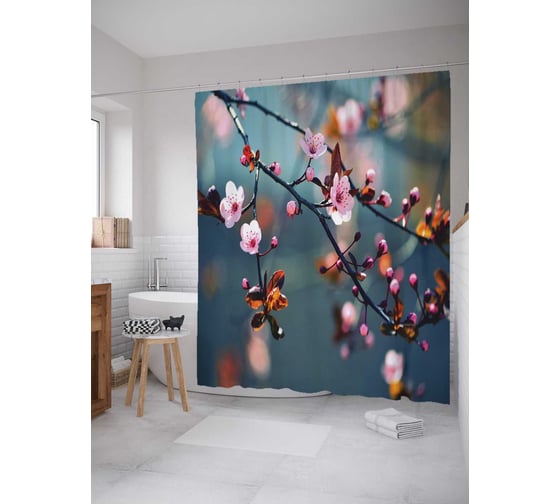 Штора (занавеска) для ванной JoyArty "Распускающиеся ветки вишни" из сатена, 180х200 см с крючками, sc_30193