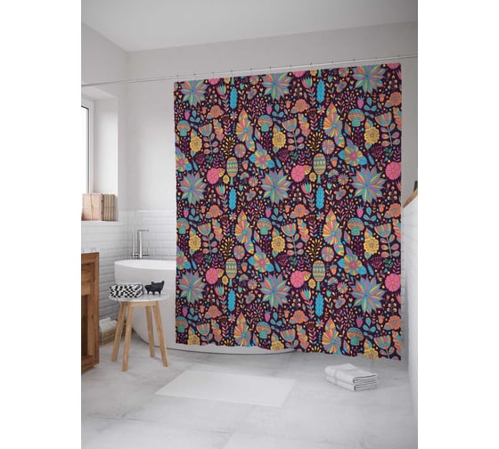 Штора (занавеска) для ванной JoyArty "Разноцветные грибы" из сатена, 180х200 см с крючками, sc_58450