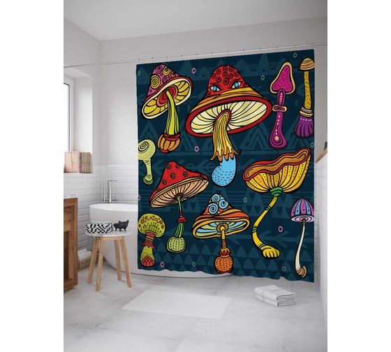 Штора (занавеска) для ванной JoyArty "Разные поганки" из сатена, 180х200 см с крючками, sc_36842