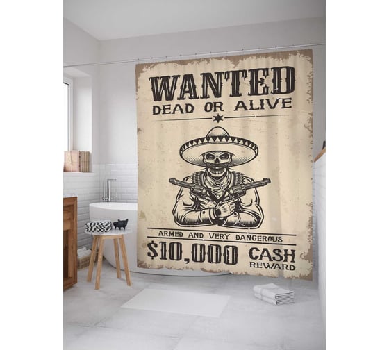 Штора (занавеска) для ванной JoyArty "Разыскивается мертвый или живой" из сатена, 180х200 см с крючками, sc_268489