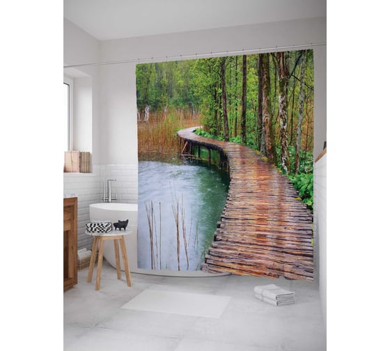 Штора (занавеска) для ванной JoyArty "Речной переход" из сатена, 180х200 см с крючками, sc_12132
