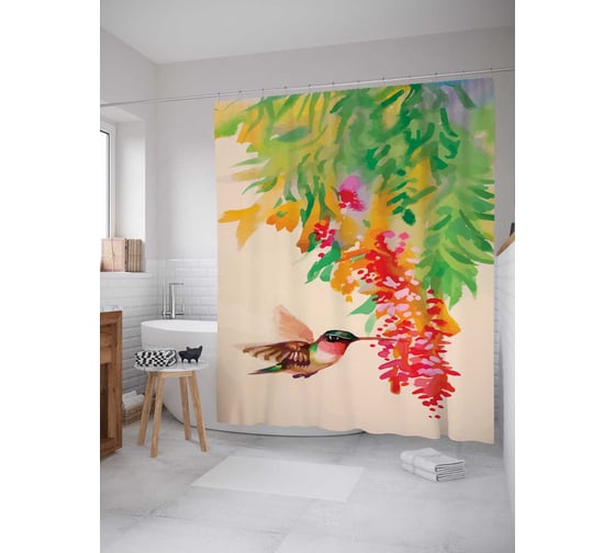 Штора (занавеска) для ванной JoyArty "Резвая колибри" из сатена, 180х200 см с крючками, sc_17098