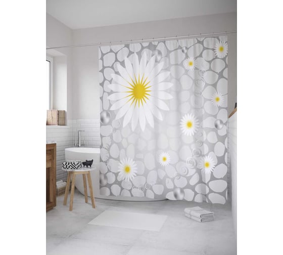 Штора (занавеска) для ванной JoyArty "Ромашки на камнях" из сатена, 180х200 см с крючками, sc_34695