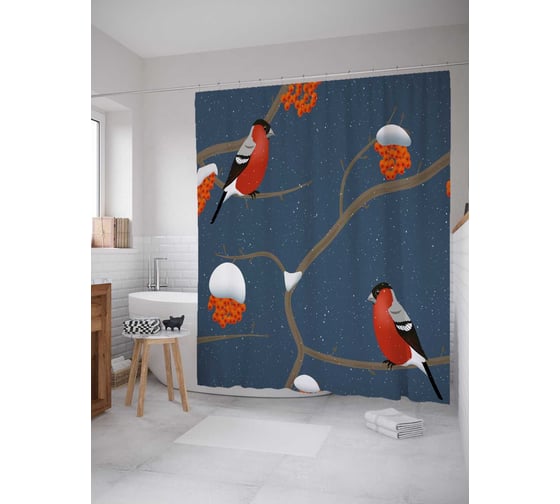 Штора (занавеска) для ванной JoyArty "Рябина в снегу" из сатена, 180х200 см с крючками, sc_38406