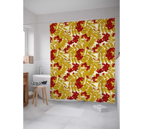 Штора (занавеска) для ванной JoyArty "Рябиновые листья" из сатена, 180х200 см с крючками, sc_38390
