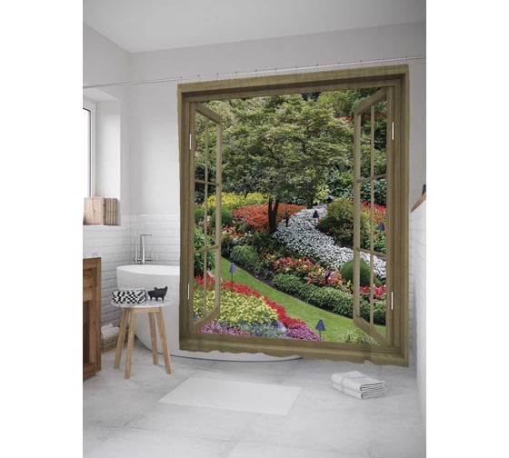 Штора (занавеска) для ванной JoyArty "Садовое окно" из сатена, 180х200 см с крючками, sc_7992