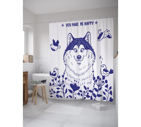 Штора (занавеска) для ванной JoyArty "Счастливый пес" из сатена, 180х200 см с крючками, sc_39423
