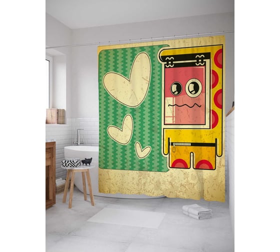 Штора (занавеска) для ванной JoyArty "Сердечный робот" из сатена, 180х200 см с крючками, sc_37351