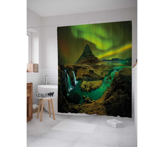 Штора (занавеска) для ванной JoyArty "Северное сияние над водопадом" из сатена, 180х200 см с крючками, sc_29274