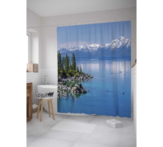 Штора (занавеска) для ванной JoyArty "Скалистые берега горного озера" из сатена, 180х200 см с крючками, sc_32748