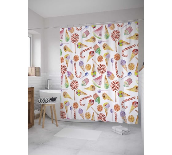 Штора (занавеска) для ванной JoyArty "Сладкие радости" из сатена, 180х200 см с крючками, sc_31555