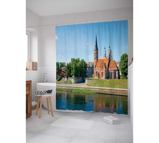 Штора (занавеска) для ванной JoyArty "Собор у воды" из сатена, 180х200 см с крючками, sc_14424