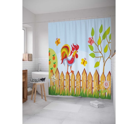 Штора (занавеска) для ванной JoyArty "Солнечный петух" из сатена, 180х200 см с крючками, sc_21622