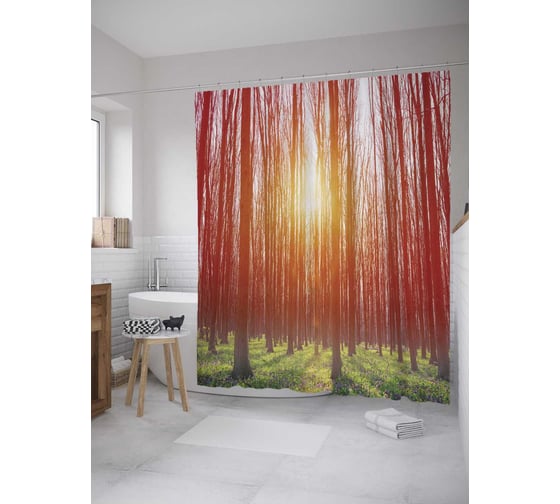 Штора (занавеска) для ванной JoyArty "Солнце в лесу" из сатена, 180х200 см с крючками, sc_8854