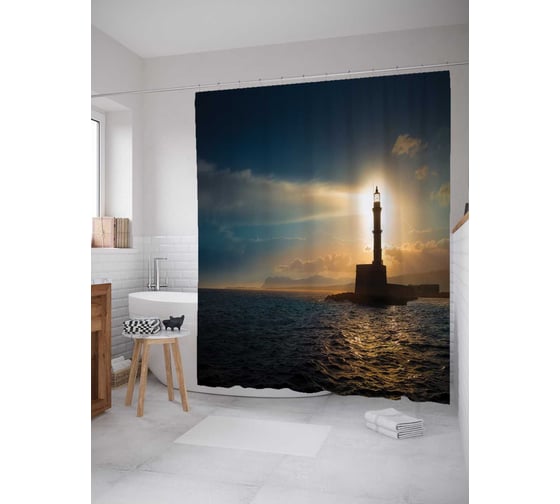 Штора (занавеска) для ванной JoyArty "Солнце в маяке" из сатена, 180х200 см с крючками, sc_12367