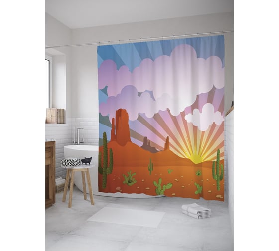 Штора (занавеска) для ванной JoyArty "Солнце всходит над пустыней" из сатена, 180х200 см с крючками, sc_59466