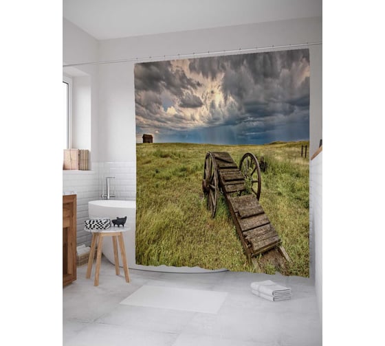 Штора (занавеска) для ванной JoyArty "Старая телега в поле" из сатена, 180х200 см с крючками, sc_38271