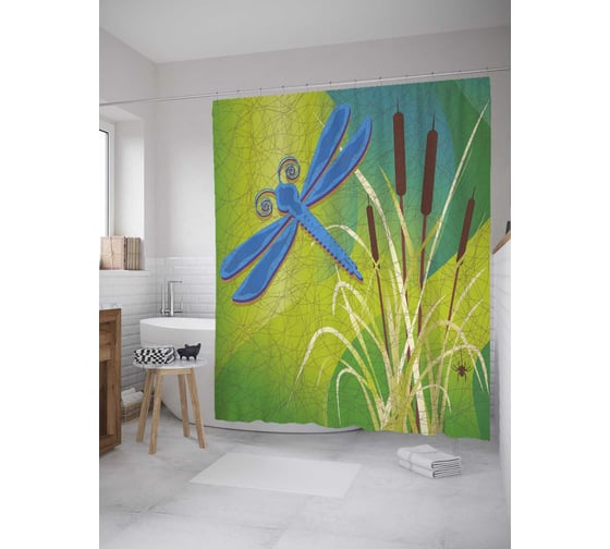 Штора (занавеска) для ванной JoyArty "Стрекоза у камышей" из сатена, 180х200 см с крючками, sc_35194
