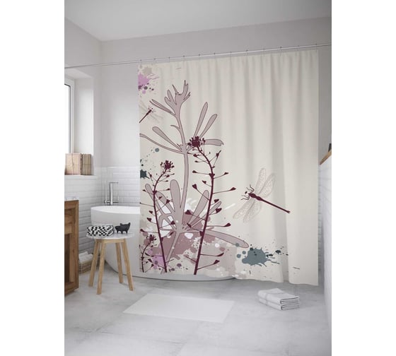 Штора (занавеска) для ванной JoyArty "Стрекозы на лугу" из сатена, 180х200 см с крючками, sc_35183